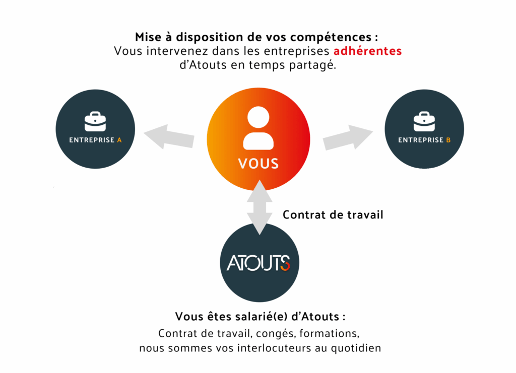 Globalement, le temps partagé consiste à répartir le temps de travail du salarié entre plusieurs entreprises dont les besoins sont équivalents en terme de compétences mais qui ne nécessite pas une embauche en CDI à temps plein. Atouts permet alors la mise en place d’un salarié durablement, en adaptant son rythme à la saisonnalité de l’activité.